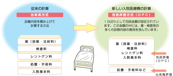 今まで個々の診療行為ごとに計算していた医療費(出来高払い方式)とは異なり、入院患者様の病気・治療内容をもとに、国で定めた『1日当たりの定額点数』からなる包括評価の範囲(投薬・注射・検査・レントゲン・入院料等)と、出来高評価の範囲(手術・麻酔・リハビリ・退院時処方等)を組み合わせて医療費を計算する方式です。